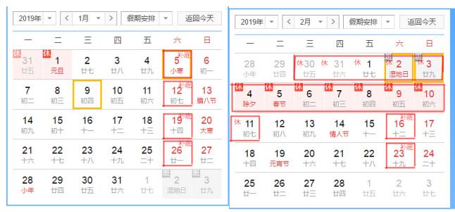 其中1月30-2月3日屬于調(diào)休補(bǔ)班(補(bǔ)班時(shí)間是1月的每周六,1月5日,1月12日,1月19日,1月26日),2月2-2月3補(bǔ)班日期是2月16日和2月23日。