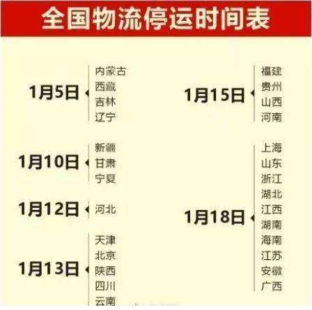 物流接貨大部分地區(qū)1月15日-1月18日停止收貨,偏遠(yuǎn)地區(qū)接貨截止時(shí)間更早些。